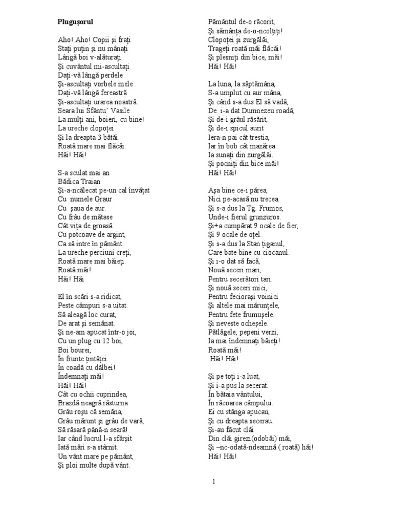 Seara lui sfântu vasile sa va fie gospodari de bine si noua de folos ca suntem plugari de jos. Nu i de la noi începutul. O nsărat o nourat noi plugari ne am adunat de prin dealuri de prin vai tot plugari de alde noi. Uraturi de anul nou seara lui sfantu vasile.